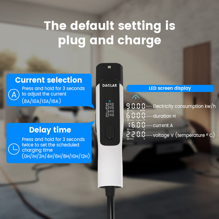 - Instelbare stroom, flexibel laden: Een eenvoudige druk van 3 seconden laat u **wisselen tussen 8A, 10A, 13A en 16A**. Optimaliseer het laden voor uw thuisnetwerk of onderweg, en bespaar elektriciteit en geld!