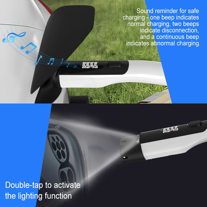 - Realtime gegevens, in één oogopslag: Het Type 2-pistool heeft een **glashelder display**, waarop vermogen, stroom, spanning en laadtijd realtime worden weergegeven. Houd moeiteloos uw **3,68KW, 230V 1-fase, 16A** laadstatus bij!