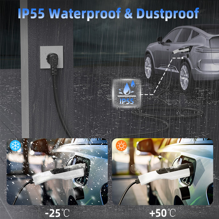 - IP55 water- en stofdicht: Gemaakt met een duurzame behuizing, onze **mobiele EV-lader met IP55-classificatie** weerstaat diverse Europese weersomstandigheden. Werkt perfect van -25℃ tot 50℃, betrouwbaar in elk klimaat.