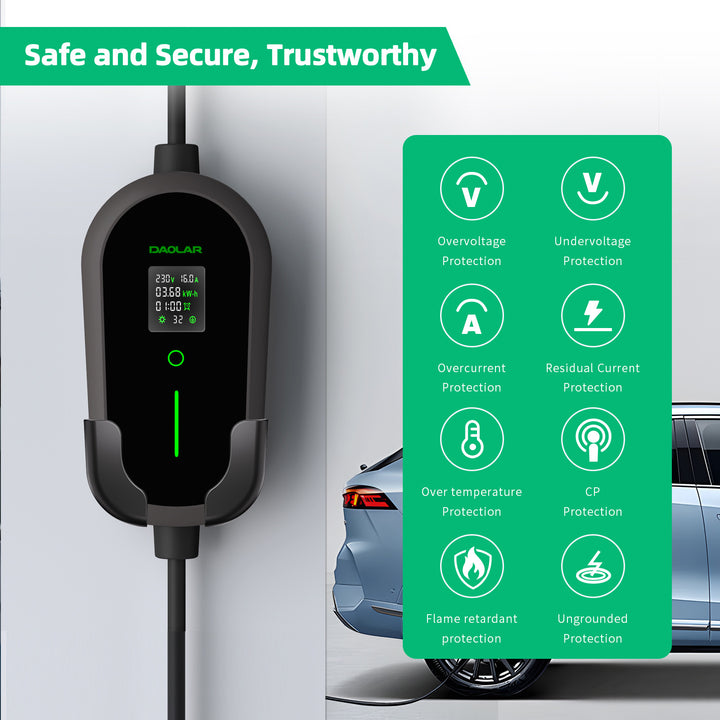 ✅ Slim opladen: Flexibele vermogensinstellingen van 6A/10A/16A/24A/32A passen zich aan het laadcircuit van uw auto aan voor extra veiligheid. Plan het opladen in voor 1 tot 12 uur en beheer uw tijd effectief door een starttijd in te stellen om pieklaadperiodes te vermijden. De lader is uitgerust met een 1,4-inch OLED-scherm dat realtime informatie weergeeft, zoals spanning, stroomsterkte, vermogen, laadtijd en temperatuur. Bovendien knippert het ledlampje in verschillende kleuren om de laadstatus en storingen van uw elektrische voertuig aan te geven.