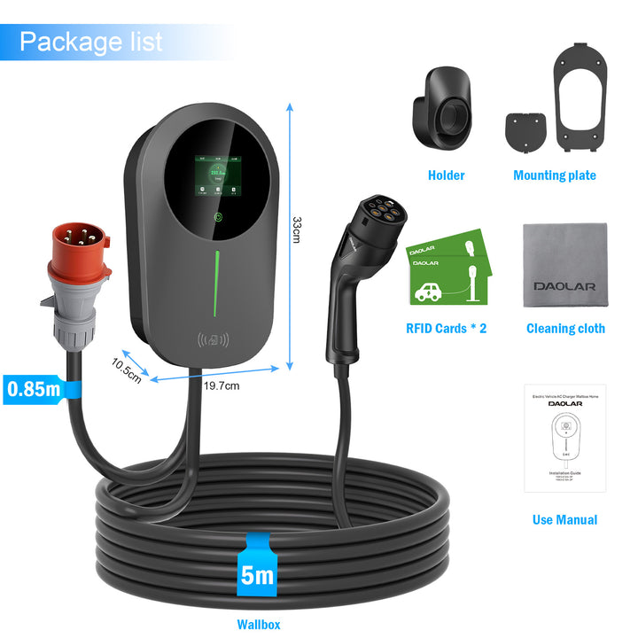 Elke Wallbox-lader wordt geleverd met een complete set accessoires voor een snelle en probleemloze installatie. De verpakking bevat 2 RFID-kaarten, een vaste wandmontagebeugel, een kabelhouder, installatieschroeven en een gebruikershandleiding. Of u hem nu thuis of op een semi-openbare locatie installeert, alles wat u nodig hebt, zit in de doos – handig, veilig en klaar voor gebruik.