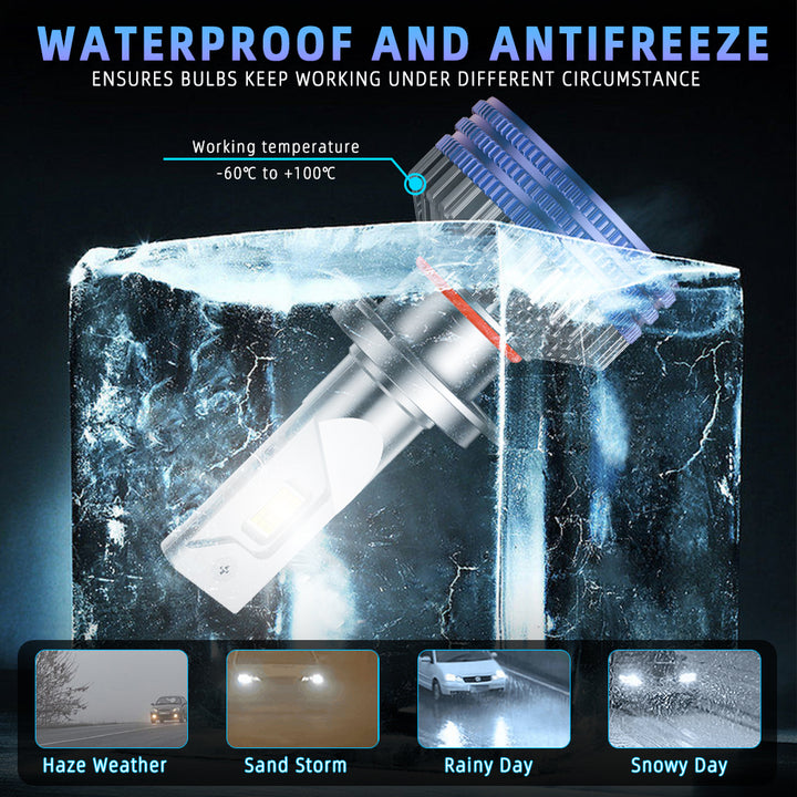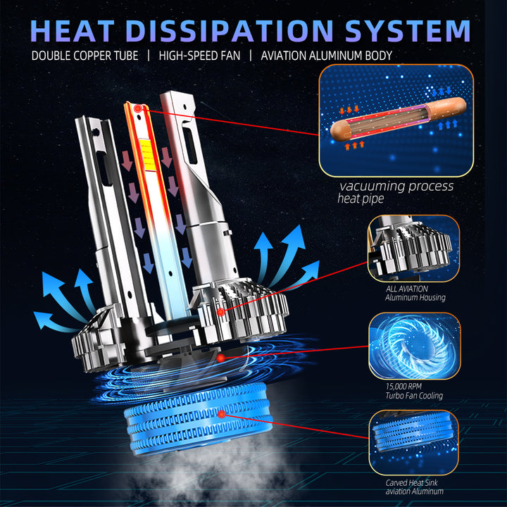 ❄️ Geavanceerd Warmteafvoersysteem voor een Levensduur van 60.000+ Uur: Ontworpen met een toonaangevend warmtebuisontwerp, Dubbele Koperen Buizen en een volledig aluminium behuizing van luchtvaartkwaliteit. Een snelle, stille 15.000 RPM Turbo Ventilator zorgt voor snelle koeling, waardoor de lampen betrouwbaar functioneren voor een enorme 60.000+ uur en werken bij extreme temperaturen van -60℃ tot +100.