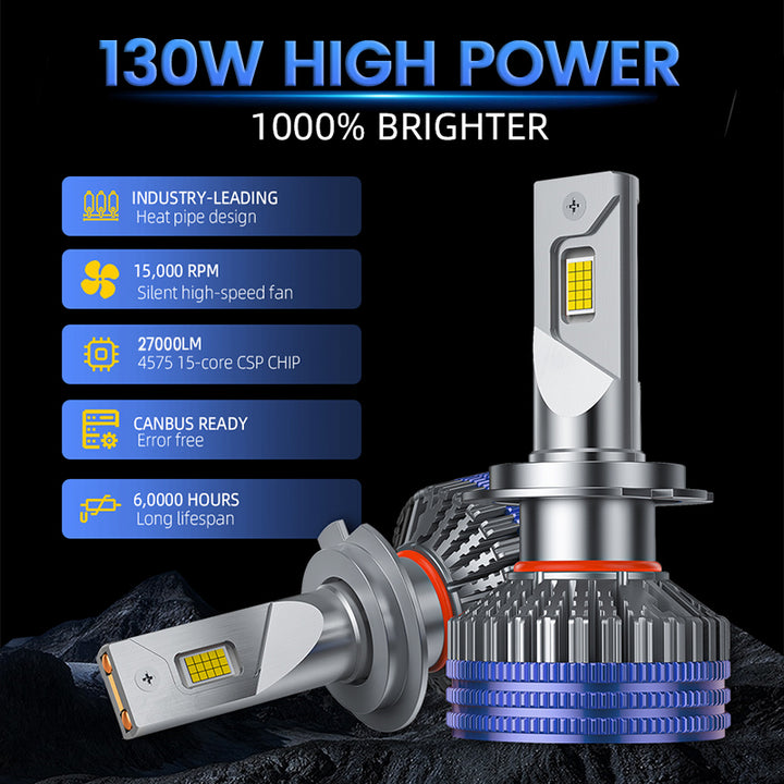 ⚡ 1000% Helderder & Ultra-Gefocuste Straal (27000LM, 130W): Upgrade van zwakke halogeen naar een toonaangevende 130W (per set) hoog vermogen, met een ongelooflijke 27.000 Lumen helder, 6500K wit licht. Voorzien van geavanceerde 15-Core CSP 4575 chips voor een supergefocust, breder en verder reikend stralingspatroon, wat zorgt voor veiliger nachtelijk rijden zonder donkere plekken.